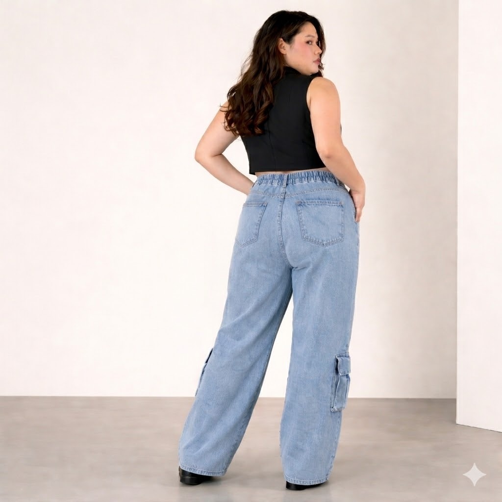 Keunggulan utama ada pada pinggang karet (elastic waist) yang fleksibel dan nyaman dipakai seharian tanpa rasa sesak — perfect untuk berbagai bentuk tubuh, termasuk jumbo size. Warna light blue washed denim memberikan nuansa casual modern yang mudah dipadukan dengan berbagai outfit.