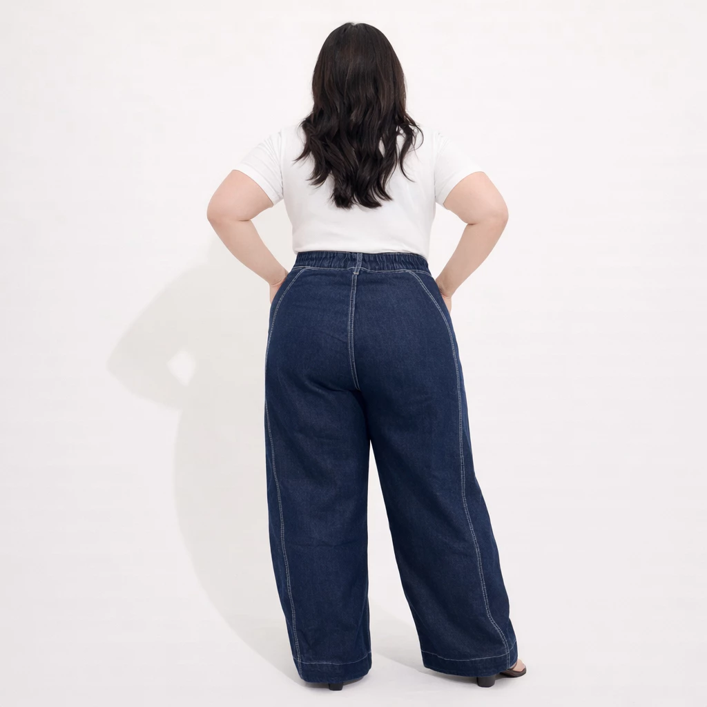 Menggunakan bahan denim berkualitas dengan warna dark blue yang elegan, Maudy Kulot hadir dengan detail jahitan kontras yang mempertegas look modern dan premium.